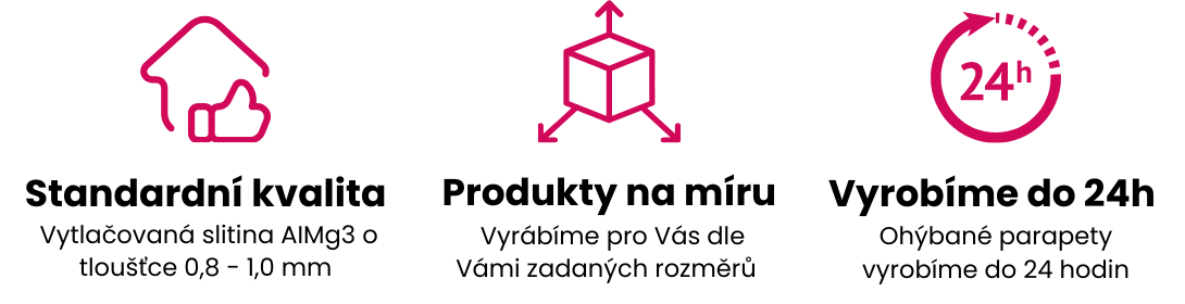 Venkovní hliníkové ohýbané parapety o tloušťce 0,8 - 1,0 mm, dvojitým nástřikem barvy a ochrannou fólií