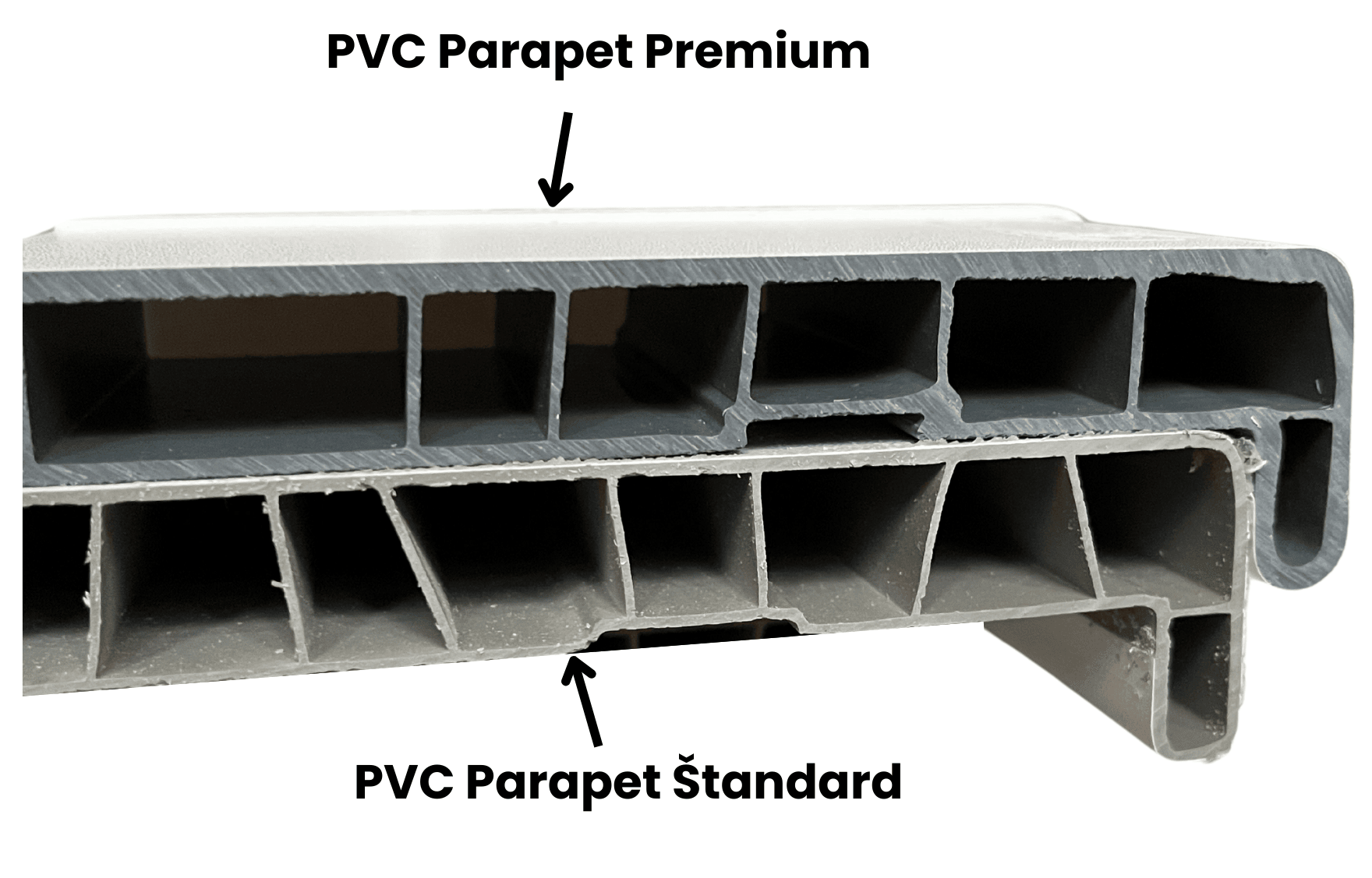 Prémiové vnútorné plastové parapety sú vyrobené spoločnosťou Vitrage z vysoko kvalitného PVC s dôrazom na extrémnu odolnosť a dlhú životnosť. Vďaka dvojnásobne hrubej vrstve plastu oproti štandarnej kvalite a vhodnému usporiadaniu plastových komôr zabezpečujú prémiové parapety najlepšiu pevnosť, stabilitu a odolnosť na slovenskom trhu.